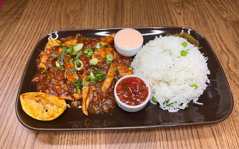 Your choice of rice or fries topped with grilled chicken, pineapple salsa, Caribbean jerk sauce, green peas, jalapeños, lime, coriander, and sour cream.