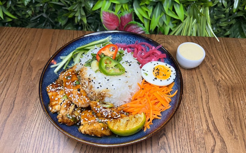 Grilled chicken fillet on rice, topped with teriyaki sauce, pickled vegetables, half-boiled egg, cucumber, chilli, coriander, spring onions, wasabi mayo, and sesame seeds.