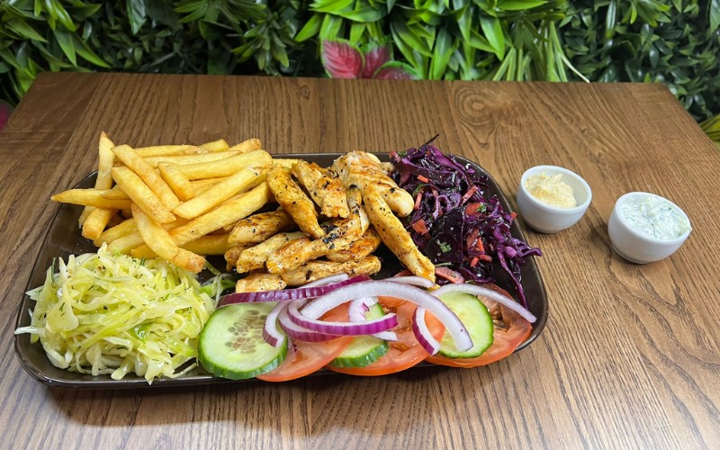 A hearty platter with marinated meat, red and white cabbage and grilled vegetables, served with crispy fries. Accompanied by garlic and spicy sauces and grilled lemon wedge.