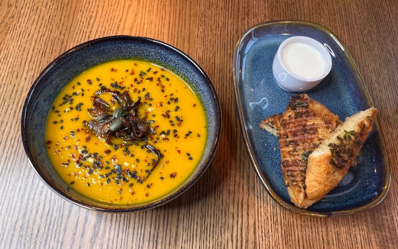 Silky carrot and pumpkin soup with roasted pumpkin seeds, crispy red onions, black sesame, chili flakes, and a swirl of cream, served with garlic bread.