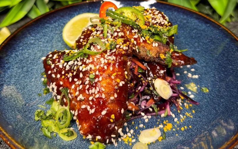 Sweet and spicy wings marinated in teriyaki sauce, garnished with sesame seeds and a touch of orange zest. Served with red cabbage, spring onions, and coriander.